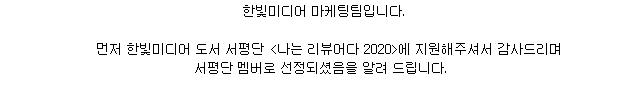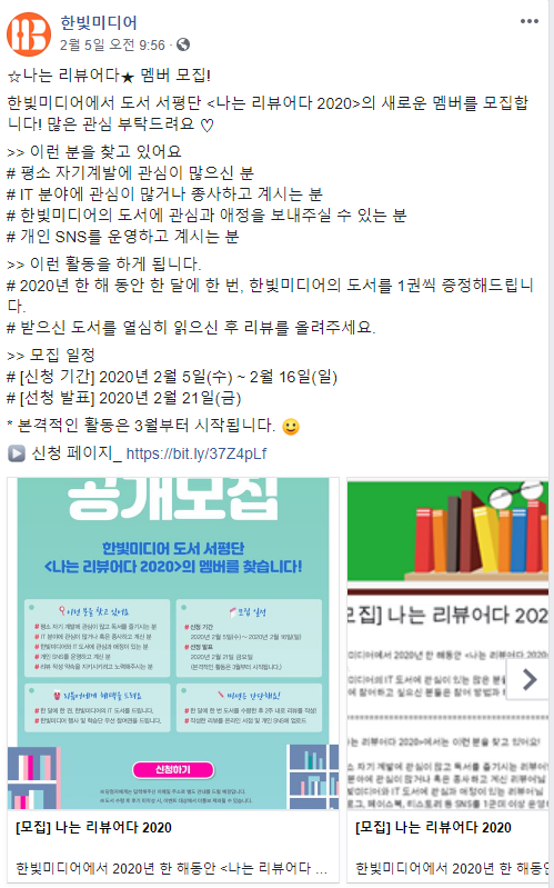 반응형 한빛미디어 <나는 리뷰어다 2020> 도서 서평단 당첨 서평단 모집 글 무려 한 해 동안 한 달에 한 권씩 증정이다. 와우 비루한 블로그지만 당장 신청했다. 당첨 메일 요즘 딱 무슨 책을 읽을지 찾아보고 책에 목말라 있었는데 좋은 책을 많이 읽을 수 있을 것 같다, 읽으면서 느낀 점을 글로 잘 표현하는 연습도 해야겠다. 어떤 책이 리스트에 있을지도 궁금하고 여러모로 기대가 된다 😃 반응형 공유하기 게시글 관리 개발후라이 저작자표시 (새창열림)