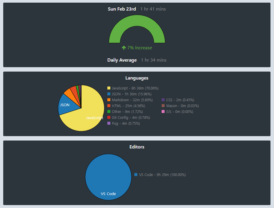 반응형 [WakaTime] VSCode 사용량 (2020년 2월 3주) 일주일 간 사용 시간: 9시간 29분 가장 많이 쓴 언어: Javascript (6시간 38분) 반응형 공유하기 게시글 관리 개발후라이 저작자표시 (새창열림)