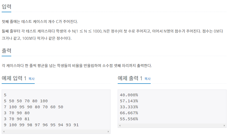문제 대학생 새내기들의 90%는 자신이 반에서 평균은 넘는다고 생각한다. 당신은 그들에게 슬픈 진실을 알려줘야 한다. 입력 첫째 줄에는 테스트 케이스의 개수 C가 주어진다. 둘째 줄부터 각 테스트 케이스마다 학생의 수 N(1 ≤ N ≤ 1000, N은 정수)이 첫 수로 주어지고, 이어서 N명의 점수가 주어진다. 점수는 0보다 크거나 같고, 100보다 작거나 같은 정수이다. 출력 각 케이스마다 한 줄씩 평균을 넘는 학생들의 비율을 반올림하여 소수점 셋째 자