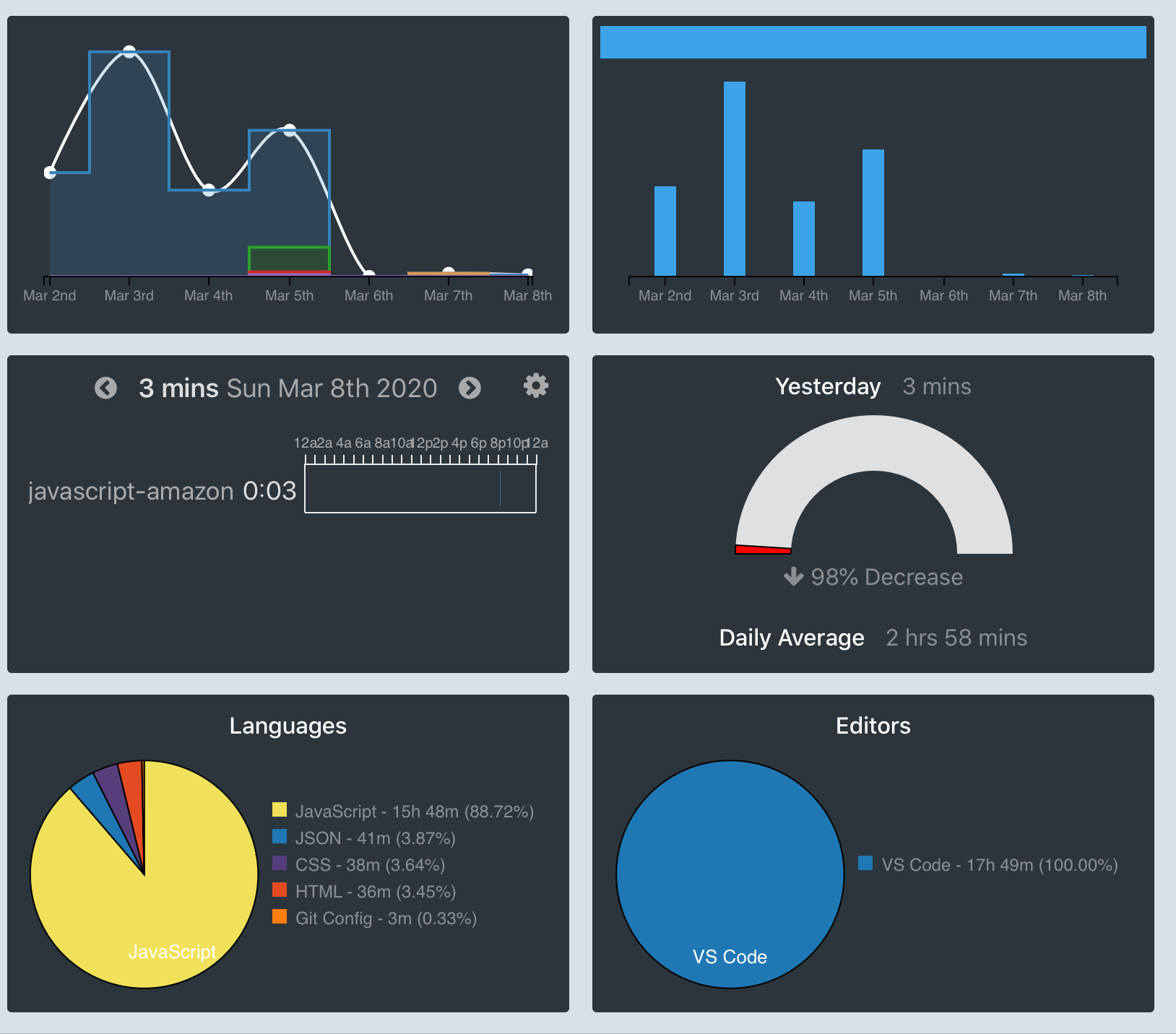 반응형 [WakaTime] VSCode 사용량 (2020년 3월 1주) 일주일 간 사용 시간: 17시간 49분 가장 많이 쓴 언어: Javascript 반응형 공유하기 게시글 관리 개발후라이 저작자표시 (새창열림)