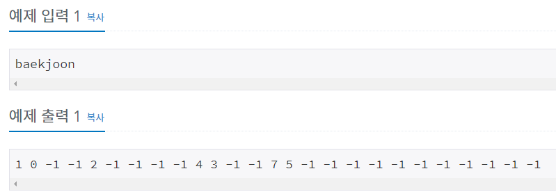 만약, 어떤 알파벳이 단어에 포함되어 있지 않다면 -1을 출력한다. 단어의 첫 번째 글자는 0번째 위치이고, 두 번째 글자는 1번째 위치이다.