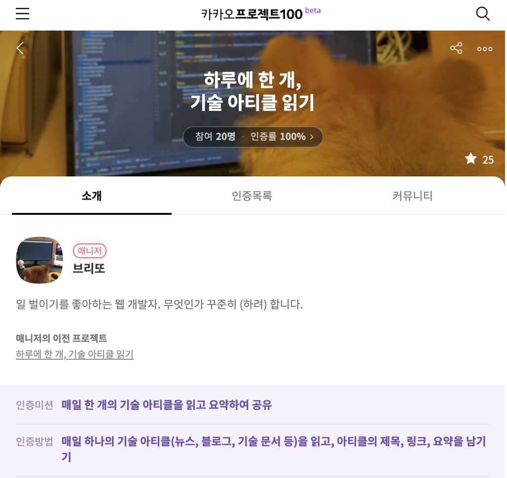 카카오 프로젝트 100은 100일동안 매일 특정 주제에 대해 실행하고 인증하며 습관을 기르게 해 주는 프로젝트입니다.