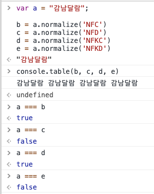 한글을 변수에 저장하면 NFC 방식으로 정규화가 진행되어 NFC/NFKC로 정규화를 했을 때는 같은 값으로 인식하고 나머지는 다른 값으로 인식합니다.