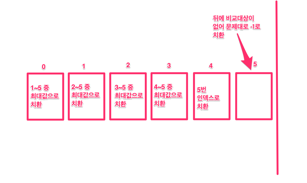 반복문을 돌면서 차례대로 그 값 이후부터의 배열 값들로 최대값을 구해 배열을 다시 구성하는 문제입니다. 마지막에는 -1을 추가하여 개수가 같도록 만들면 끝입니다.