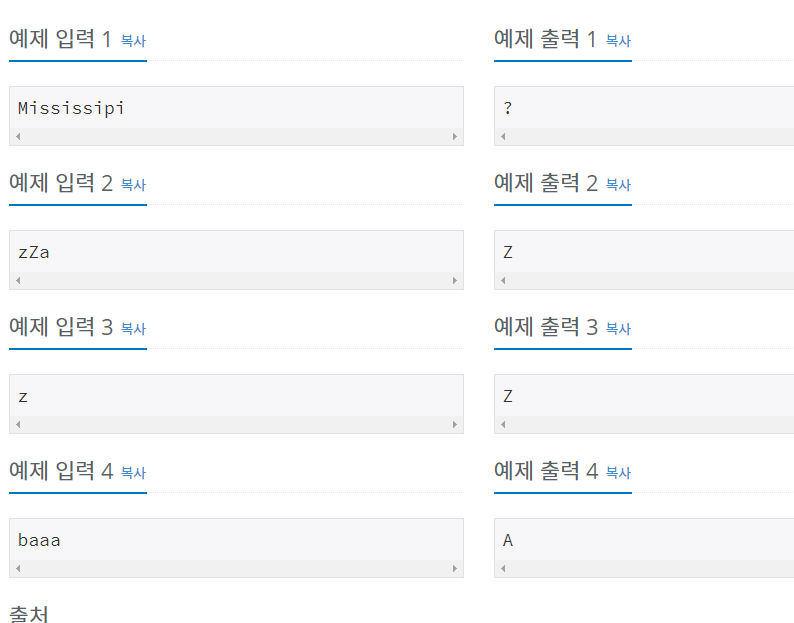 카운트해서 저장하는 리스트를 만들어 최대값이 나온 문자를 찾는 문제
